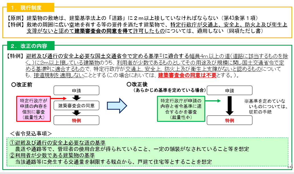 | 第43条の2 | その敷地が四メートル未満の道路にのみ接する建築物に対する制限の付加 | ||