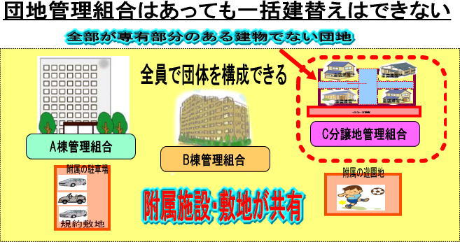 一棟だけの建替えも、複数の棟、団地内にある戸建も建替え可能です。ここの団地内には、区分所有建物以外の戸建が存在してもかまいません。